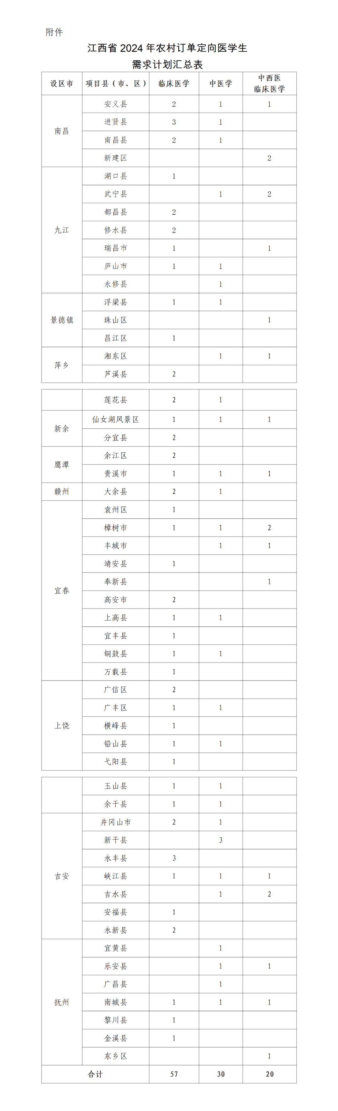 附件:江西省2024年农村订单定向医学生需求计划汇总表