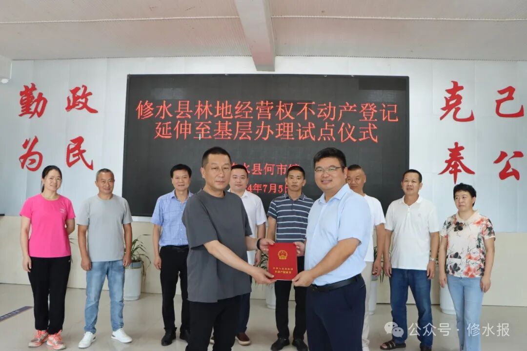 7月5日,修水县林地经营权不动产登记延伸至基层办理试点仪式在何市镇举行,并颁发全市第一张在乡镇层面办理的林地经营权不动产证,标志着我县在乡镇办理林地经营权不动产证迈出了坚实的第一步,成功打通林权流转服务的“最后一公里”。